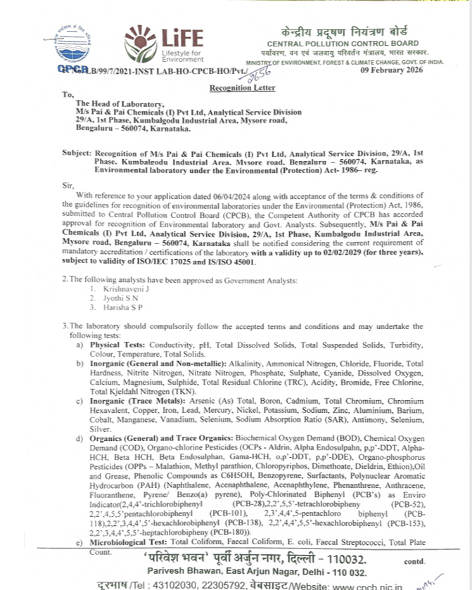 Pai & Pai Chemicals – Analytical Division Pai & Pai Chemicals is pleased to announce that its Analytical Division has received approval from the Ministry of Environment, Forest and Climate Change (MoEFCC), Government of India, in accordance with applicable environmental regulations and statutory guidelines. This certification affirms that our Analytical Division operates in full compliance with the standards prescribed by the MoEFCC for environmental monitoring, testing, and analytical services. The approval reflects our commitment to: Regulatory compliance and statutory adherence Scientific integrity and analytical accuracy Environmental sustainability and responsible operations Quality-controlled laboratory practices The Analytical Division is equipped with advanced instrumentation, validated methodologies, and qualified technical personnel to ensure precise and reliable environmental analysis. Our systems and processes align with national environmental frameworks and support regulatory reporting requirements. With MoEFCC approval, Pai & Pai Chemicals strengthens its role as a trusted partner for environmental compliance, industrial monitoring, and analytical consultancy services. We remain committed to maintaining the highest standards of operational excellence and environmental responsibility. For further information regarding our certification scope and analytical capabilities, please contact No: 9980957951 Mail to: enquiry@paigroup.co.in